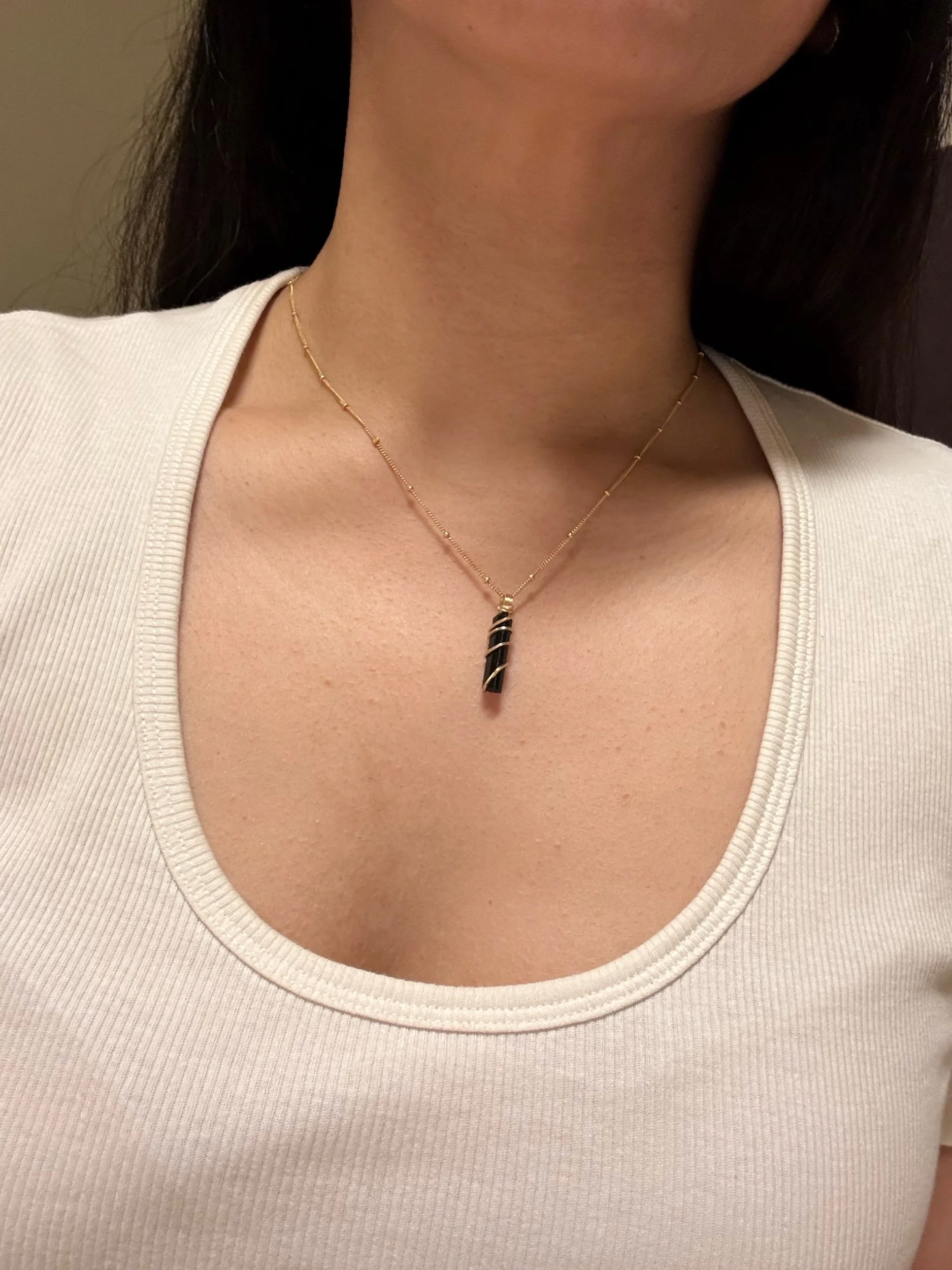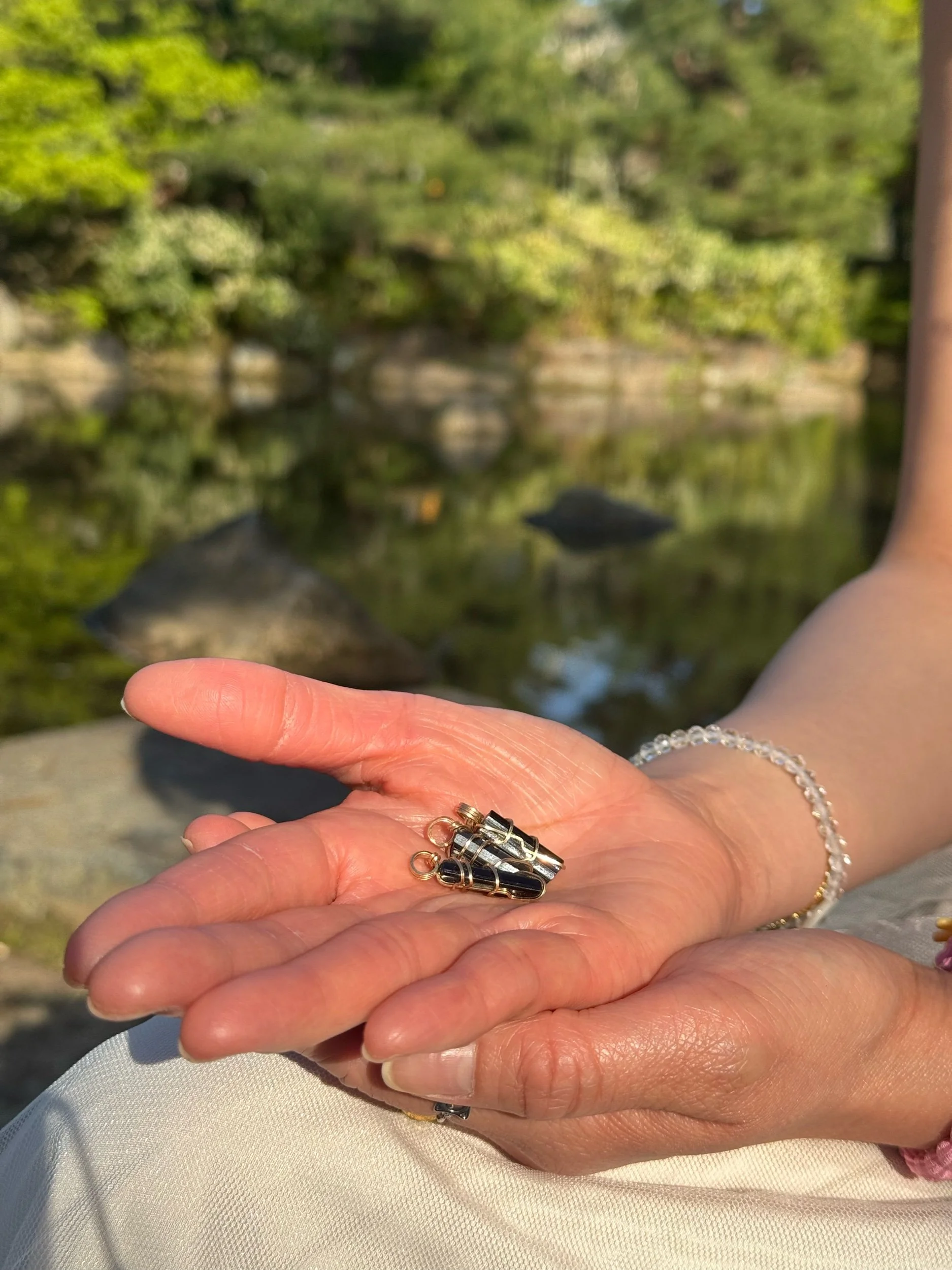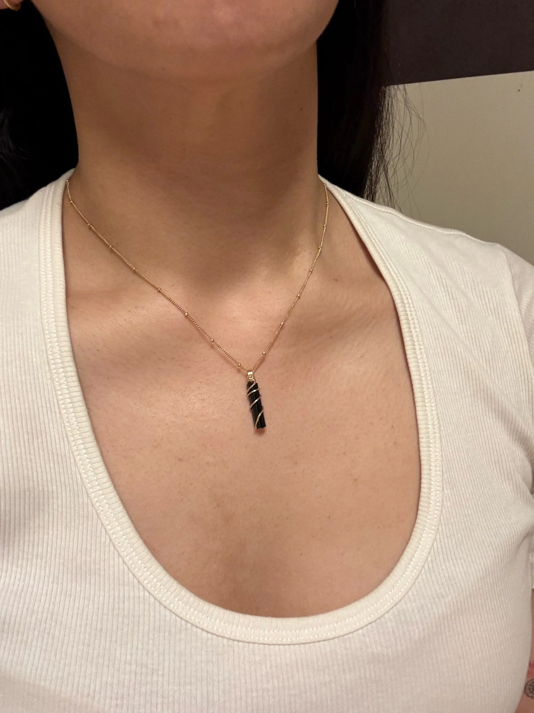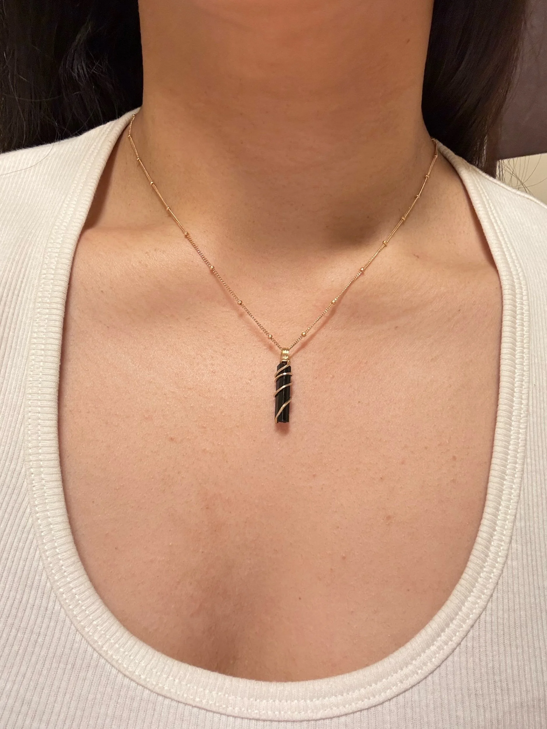 These black crystals were chosen to be made into your core jewellery. These Tourmalines are enwrapped in 14k gold filled wire. Your necklace is genuine and cleansed, empowered with Reiki.